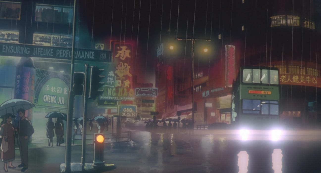 GITS is less aesthetically pleasing, color-wise. It’s equipped with muted colors, the leaden-like city and the anxiety-inducing rusty sky. Neon-inspired coloring and lighting are ever-present in modern times for good reason - strong colors and gradients, sometimes complimentary, induce a dreamy state and a place of respite among the darkness of the urban night and its perils.